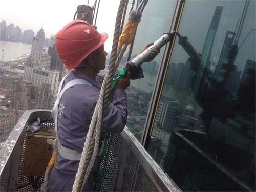 (2)外墻清潔時(shí),操作不當(dāng)容易對(duì)幕墻造成損壞,例如清潔公司的吊籃掛繩,往往直接掛在幕墻頂部膠縫上,來回摩擦拉裂膠縫,造成滲水。玻璃清潔劑如不采用中性清潔劑,或清潔后未用清水沖洗干凈,會(huì)產(chǎn)生腐蝕,損壞密封性能。