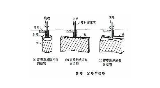 噴嘴噴發(fā)時(shí),一面提高,一面進(jìn)行旋噴則構(gòu)成柱狀體;一邊提高,一邊進(jìn)行擺噴構(gòu)成啞鈴狀;當(dāng)一邊噴發(fā),一邊提高,方向固定不變時(shí),構(gòu)成定噴,則成板狀體。