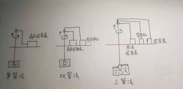 高壓噴發(fā)灌漿的施工辦法有:?jiǎn)喂芊?、二管法、三管?詳見手稿圖)。